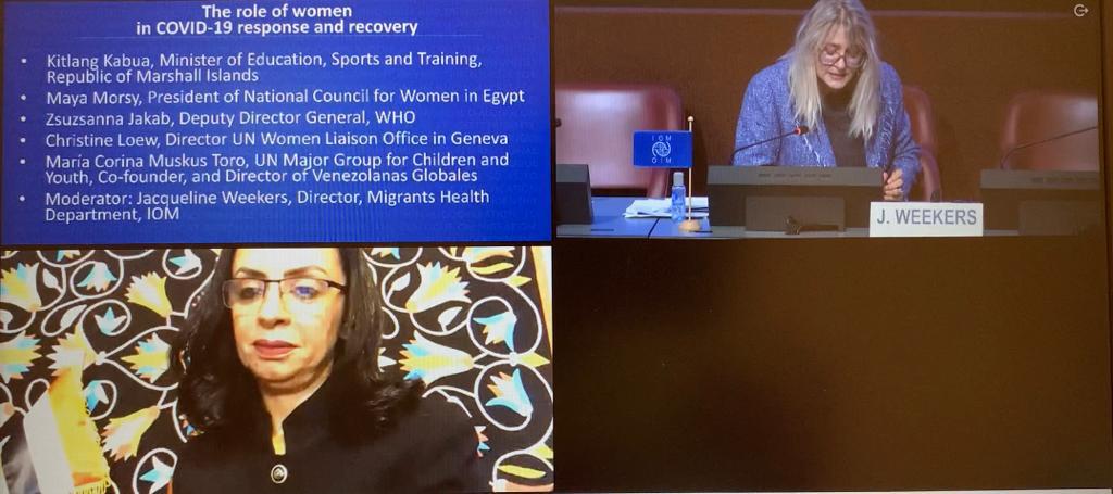 شاركت الدكتورة مايا مرسي رئيسة المجلس القومي للمرأة، اليوم، في جلسة حول دور المرأة في الاستجابة والتعافي من جائحة كورونا ضمن الحوار الدولي للهجرة 2020 الذي نظمته منظمة الهجرة الدوليه عبر تقنية الفيديو كونفرانس بعنوان " جائحة كوفيد-19: إعادة تصور دور المهاجرين والحراك البشري في تحقيق أهداف التنمية المستدامة".