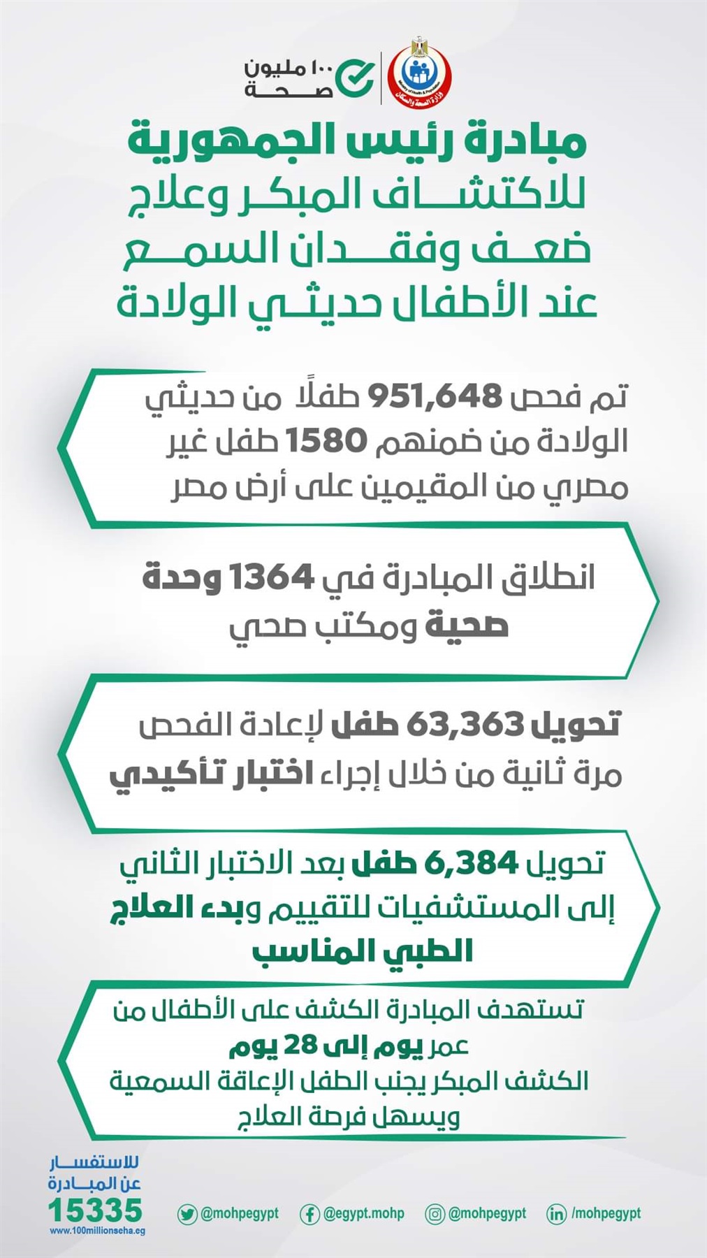 أعلنت وزارة الصحة، عن إنجازات مبادرة رئيس الجمهورية للاكتشاف المبكر وعلاج ضعف وفقدان السمع عند الأطفال حديثي الولادة، وذلك منذ انطلاقها في سبتمبر العام الماضي وحتى الآن.