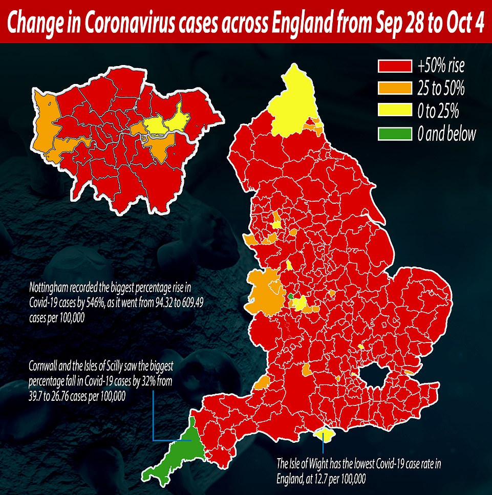 وبحسب صحيفة ديلي ميل البريطانية، سجل 69 مقاطعة من أصل 149 انخفاضا في معدلات الإصابة بمرض كوفيد -19 من ضمن عدد السكان في فترة السبعة أيام الماضية التي انتهت في 18 أكتوبر، حيث شهدت مقاطعتان انخفاضا في الإصابات في الأسبوع المنتهي في 25 سبتمبر.