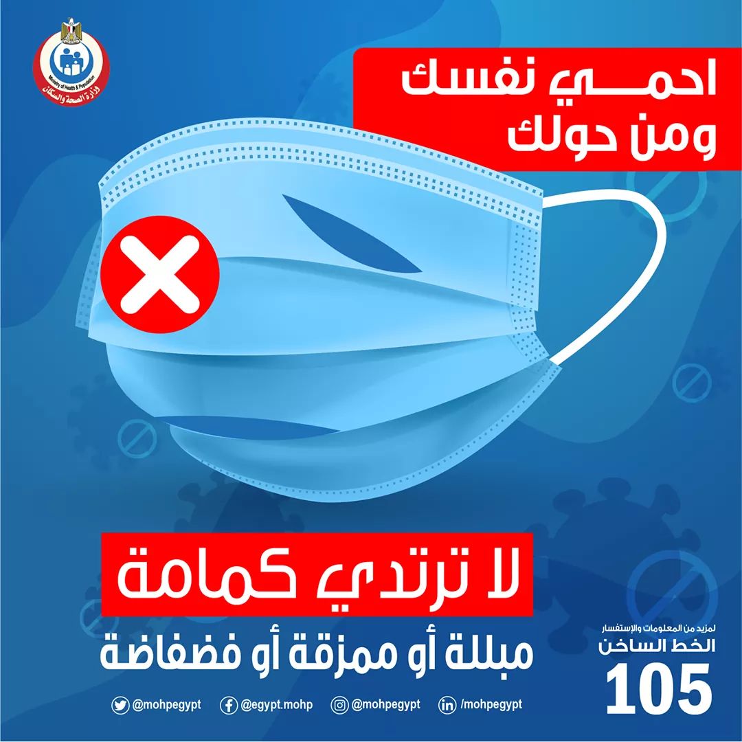 وقالت فى منشور لها اليوم علي صفحات التواصل الاجتماعي: لا ترتدى كمامات ممزقة أو فضفاضة أو مبللة.