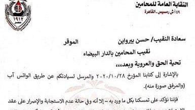 يشار إلى أن «عطية»، خاطب نقيب الدار البيضاء، الأربعاء، وأكد أن الدعوة لاجتماع غدا السبت، تفتقد إلى المشروعية لصدورها من غير الأمين العام لاتحاد المحامين العرب، والذي يمتلك وحده دون غيره حق الدعوة لهذا الاجتماع؛ وهو ما تم بالفعل حيث إنه وجه إلينا الدعوة بتاريخ 25/10/2020، لحضور انعقاد اجتماع المكتب الدائم في 19 نوفمبر 2020.