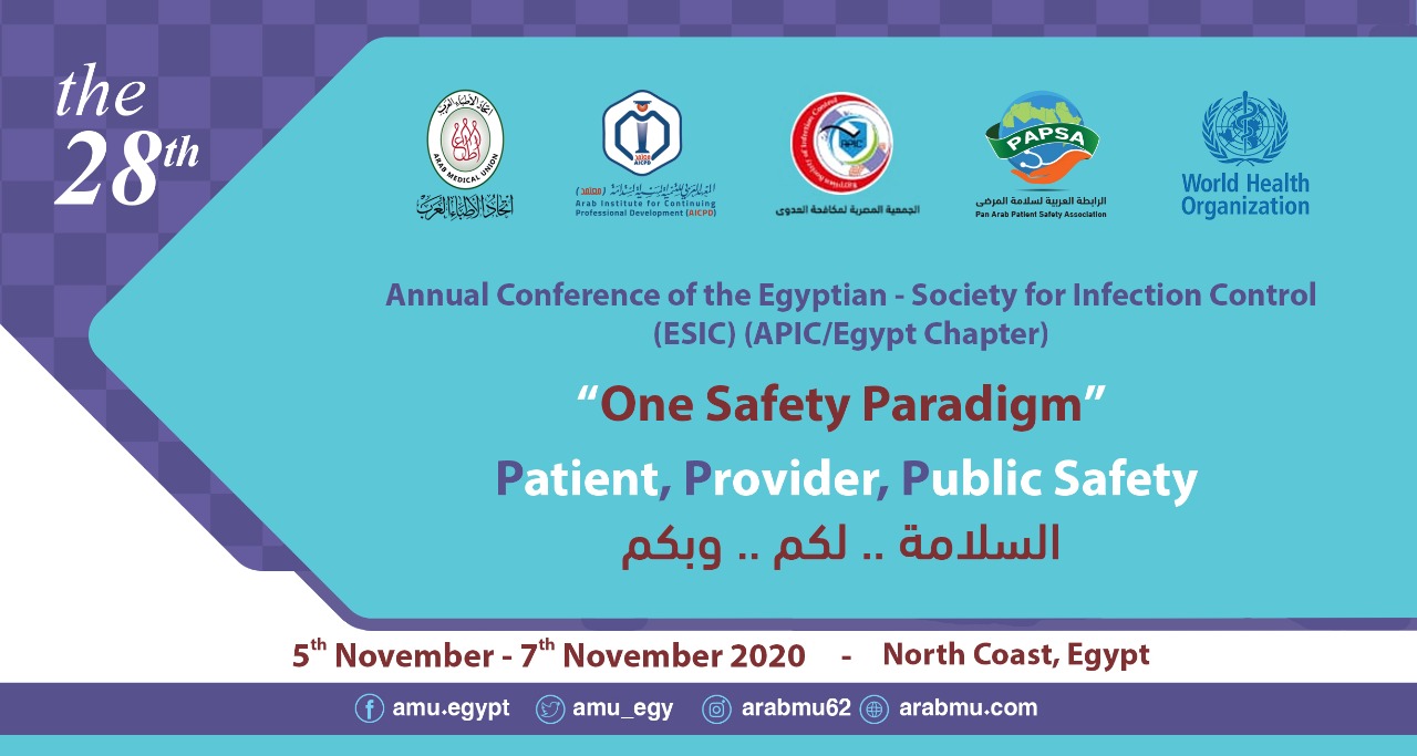 تنظم الجمعية المصرية لمكافحة العدوى- بالتعاون مع المعهد العربي للتنمية المهنية المستدامة، والرابطة العربية لسلامة المرضي- مؤتمرها العلمى الـ 28 تحت عنوان "السلامة لكم وبكم" في الفترة من 5 – 7 نوفمبر المقبل، بهدف نشر الوعي والتوعية لسلامة المرضى، وأفراد الطاقم الطبى داخل المنشآت الصحية.