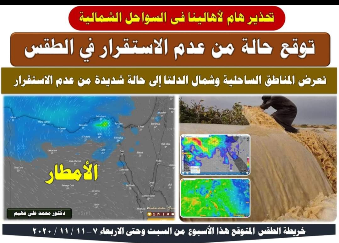 حذر مركز المناخ الزراعى بمركز البحوث الزراعية بوزارة الزراعة، أهالى المناطق الساحلية وشمال الدلتا، منمنخفض جوي "عميق" يضرب أقصى مناطق شمال الجمهورية بداية هذا الأسبوع (السبت 7 نوفمبر 2020).. وقد يتحول إلى "عاصفة مطرية ورعدية قوية"، تصل فيها سرعات الرياح الى أكثر من 40 كم/ساعة وكميات أمطار تتعدى 5 مم/يوم، مع وجود هبات من البرد (كرات الثلج)، وستكون مطروح والساحل الشمالى بالخصوص فى وسط هذه الحالة، وقد تمتد لمناطق الداخل فى الدلتا وقد تصل إلى القاهرة.