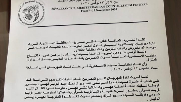 قررت إدارة مهرجان الإسكندرية لدول البحر المتوسط إلغاء حفل الافتتاح، نظرا للظروف الطارئة والخاصة بحالة الجو في محافظة الإسكندرية.
