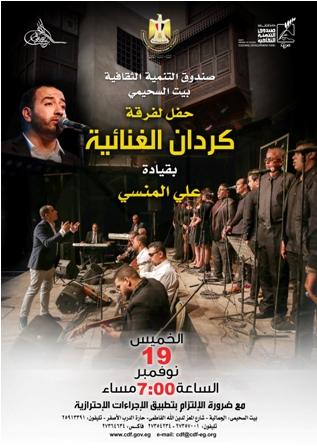 يستقبل بيت السحيمي التابع – لقطاع صندوق التنمية الثقافية- بشارع المعز- الفنان علي المنسي وفرقته "كردان" وذلك في السابعة مساء الخميس 19 نوفمبر 2020م ، حيث تقدم الفرقة مجموعة من الأغاني اللتراثية المتنوعة، يؤديها عدد من المطربين المتميزين.
