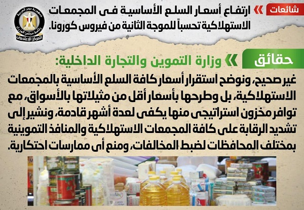 وقام المركز الإعلامي لمجلس الوزراء بالتواصل مع وزارة التموين والتجارة الداخلية، والتي نفت تلك الأنباءمُؤكدةً أنه لا صحة لارتفاع أسعار أي من السلع الأساسية في المجمعات الاستهلاكية، مُوضحةً استقرار أسعار كافة السلع الأساسية بالمجمعات الاستهلاكية، بل وطرحها بأسعار أقل من مثيلاتها بالأسواق، مع توافر مخزون استراتيجي منها يكفي لعدة أشهر قادمة، مُشيرةً إلى تشديد الرقابة على كافة المجمعات الاستهلاكية والمنافذ التموينية بمختلف المحافظات لضبط المخالفات، ومنع أي ممارسات احتكارية.