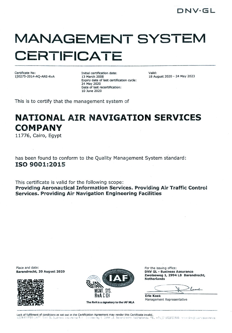 حصلت الشركة الوطنية لخدمات الملاحة الجوية إحدى الشركات التابعة للشركة القابضة للمطارات والملاحة الجوية - على تجديد إعتماد شهادة الأيزو لمدة ثلاث سنوات، وهو الإعتماد الخاص بمطابقة معايير واجراءات جودة النظام الإداري بالشركة.