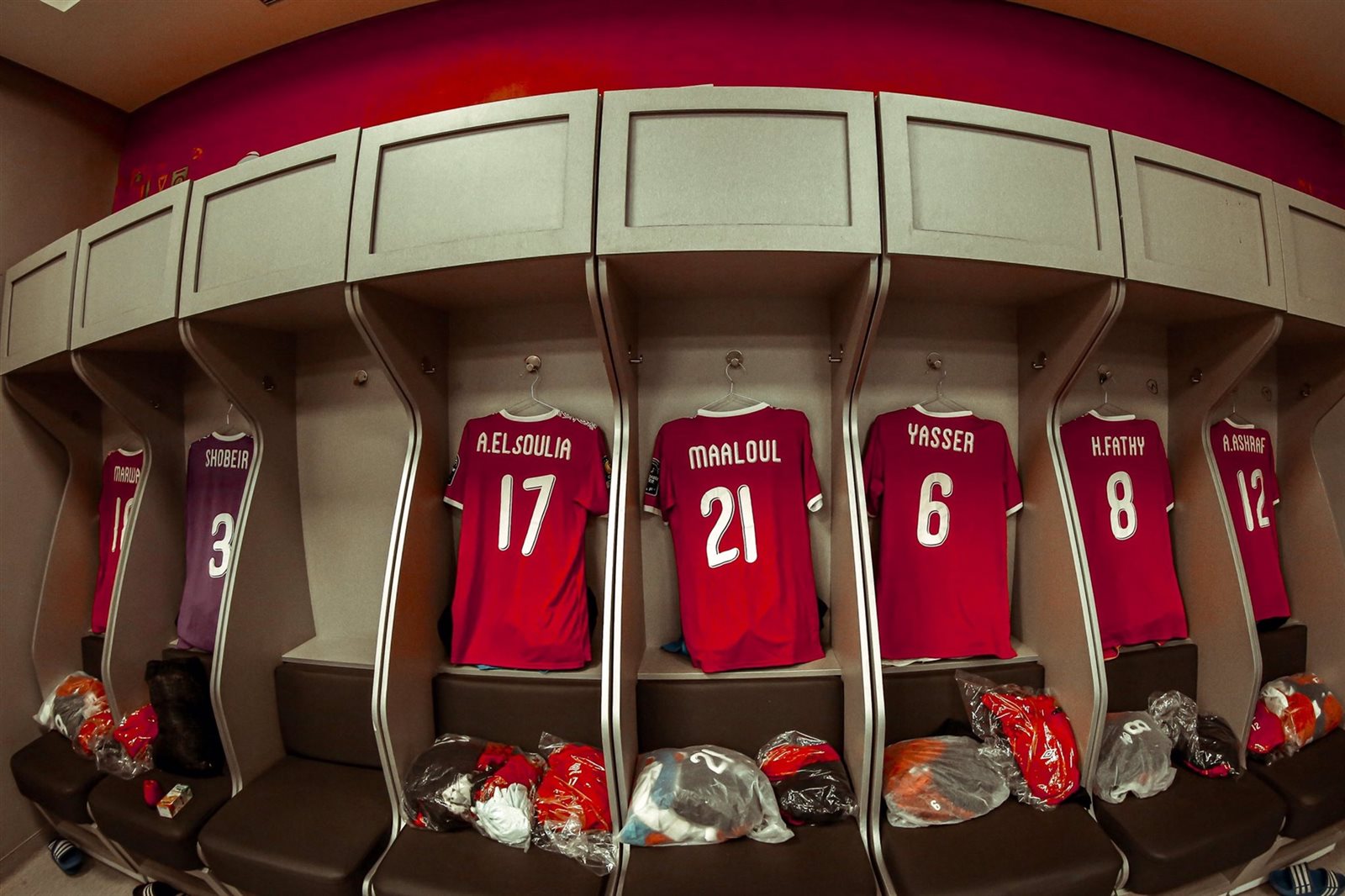 ونشرت الصحة الرسمية للنادي الأهليعلى مواقع التواصل الاجتماعي صورا من داخل غرفة ملابس لاعبيالفريق بإستاد القاهرة قبل مواجهة الزمالك معلق فيها تشيرتات لاعبي الفريق قبل انطلاق المباراة بساعات قليلة.