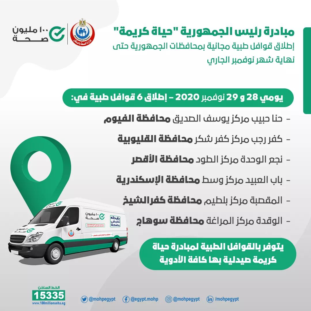أطلقت وزارة الصحة والسكان، 6 قوافل طبية ضمن مبادرة رئيس الجمهورية "حياة كريمة".