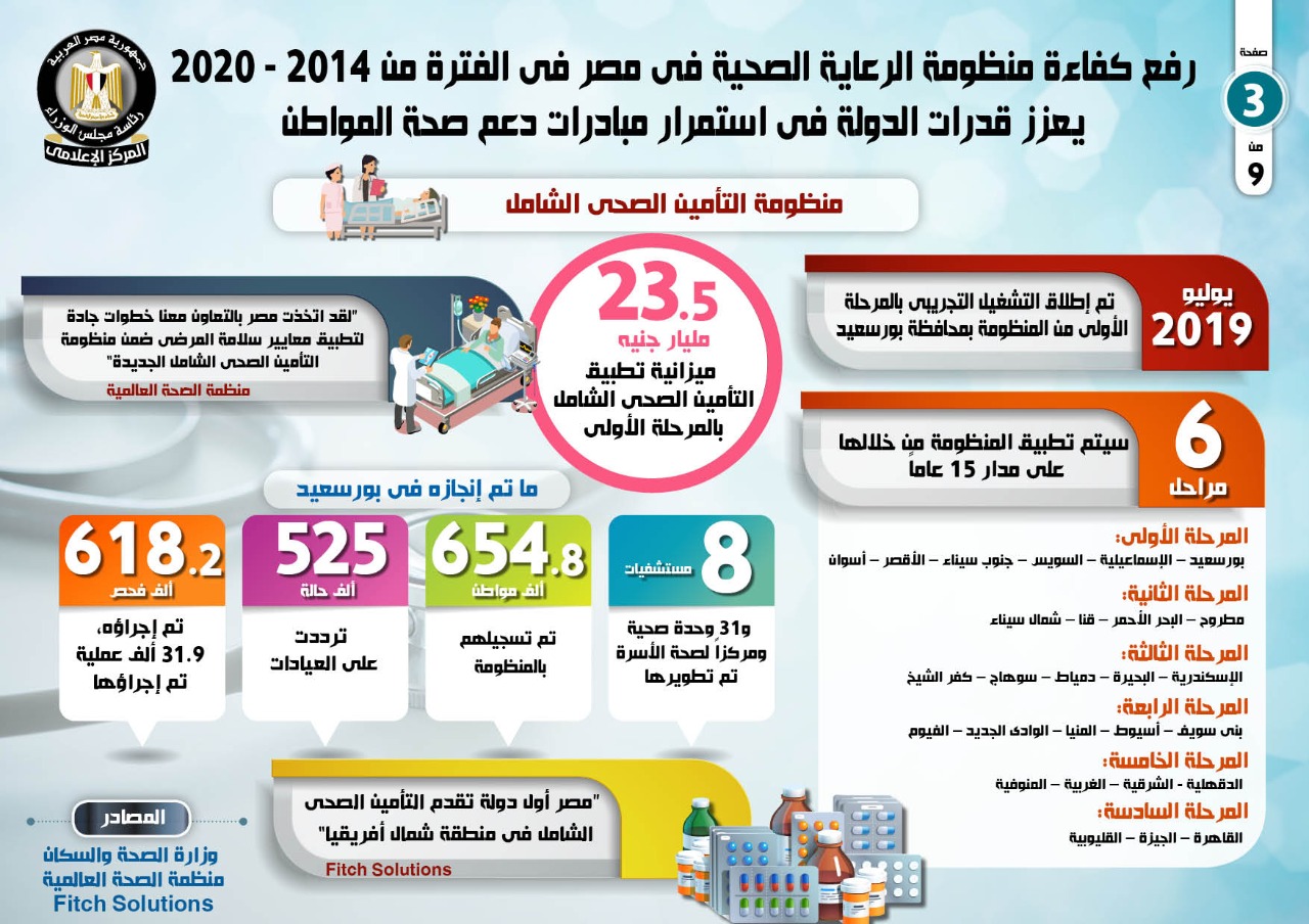 وأشار إلى أنه تم إطلاق التشغيل التجريبي بالمرحلة الأولى من منظومة التأمين الصحي الشامل بمحافظة بورسعيد في يوليو 2019، حيث تم تطوير 8 مستشفيات و31 وحدة صحية ومركزًا لصحة الأسرة، كما تم تسجيل نحو 654.8 ألف مواطن بالمنظومة، في حين بلغ عدد المترددين على العيادات نحو 525 ألف حالة، بينما تم إجراء 618.2 ألف فحص، و31.9 ألف عملية.