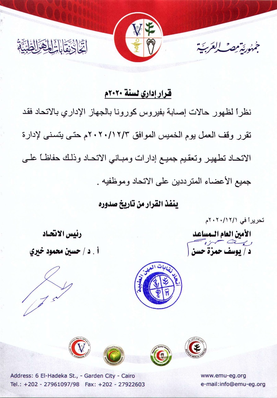 قرر اتحاد نقابات المهن الطبية، وقف العمل بمقر الاتحاد، يوم الخميس المقبل، 3 ديسمبر 2020، نظرا لظهور حالات إصابة بفيروس كورونا المستجد بالجهاز الإدارى بالاتحاد، حتى يتسنى لإدارة الاتحاد تطهير وتعقيم جميع الإدارات والمبانى التابعة للاتحاد، على أن يتم استئناف العمل يوم الأحد 6 ديسمبر 2020.