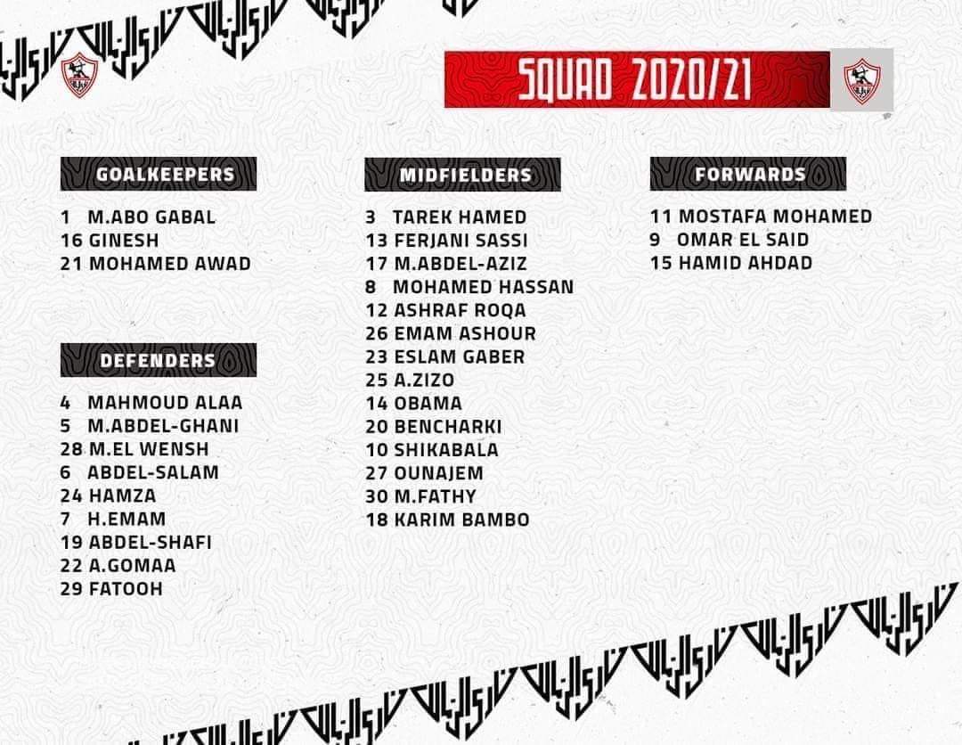 أعلن نادي الزمالك عن قائمة الفريق الملحية في الموسم المقبل وارقام قمصان اللاعبين وتضم القائمة ٢٩ لاعبا هم :