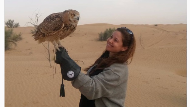 وظهرت ريا ابى راشد فى صحراء الامارات وهى تحمل صقرا على يديها .