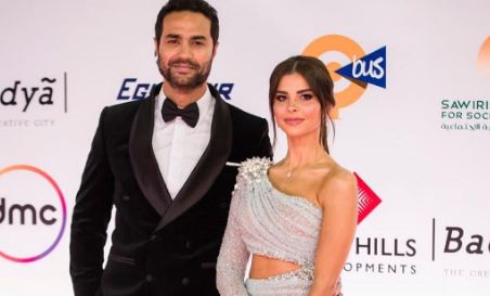 وظهر كريم فهمي في الصور برفقة زوجته في مهرجان القاهرة السينمائي ، حيث ارتد زوجته فستان سيمبل لبني .