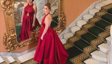وظهرت نسرين طافش في الصوة بشكل متألق مرتدية فستان احمر منفوش ، وتسريحة شعر بسيطة .