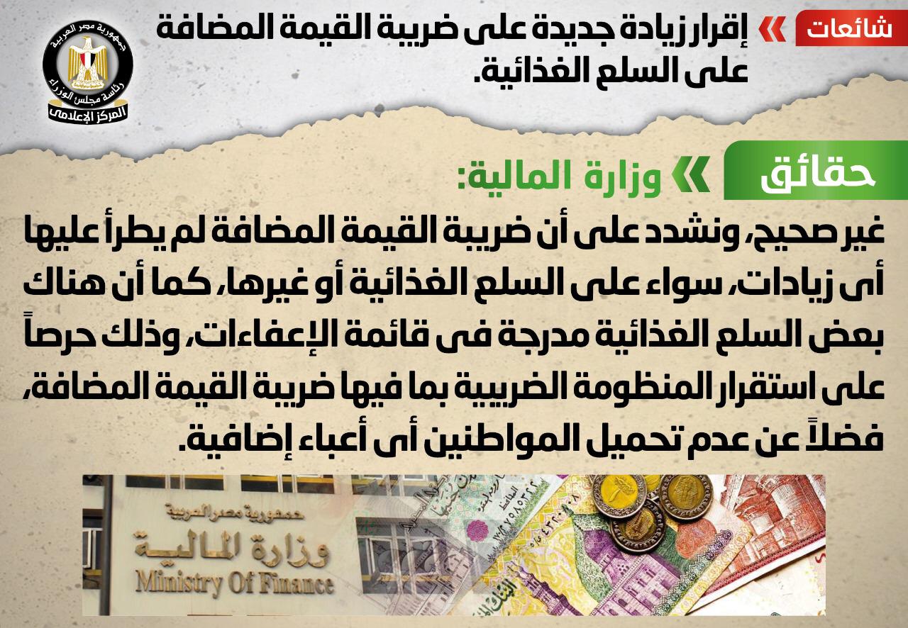 وقام المركز الإعلامي لمجلس الوزراء بالتواصل مع وزارة المالية، والتي نفت تلك الأنباء، مُؤكدةً أنه لا صحة لإقرار أي زيادة جديدة على ضريبة القيمة المضافة على السلع الغذائية.