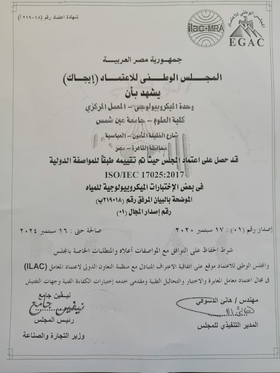 حصلت وحدة الميكروبيولوچىالمعمل المركزيبكلية العلوم جامعة عين شمس لأولمرة على اعتماد المجلس الوطنى للإعتماد "ايجاك"، وذلكتحت رعاية د. محمود المتينى رئيس جامعة عين شمس.