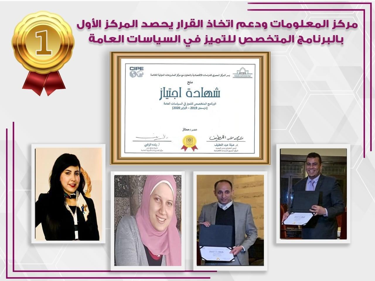 حصل فريق من باحثي مركز المعلومات ودعم اتخاذ القرار بمجلس الوزراء على المركز الأول للمرة الثانية على التوالي في"البرنامج المتخصص للتميز في السياسات العامة 2020" في دورته الثانية، والذي أطلقه المركز المصري للدراسات الاقتصادية بالتعاون مع "مركز المشروعات الدولية الخاصة" خلال الفترة من ديسمبر 2019 - فبراير 2020.