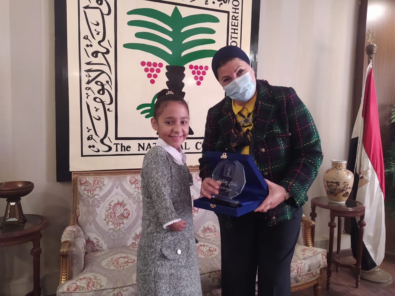 وخلال اللقاء أهدت الدكتورة سحر السنباطي الطفلة رحمة درع المجلس القومي للطفولة والأمومة تقديرا لتمييزها وإصرارها على النجاح. كما حدثتها عن المبادرة الوطنية لتمكين البنات "دوّي" والتي ينفذها المجلس دعما للفتيات وأن دوّي هي صيحة الفوز والانتصار.