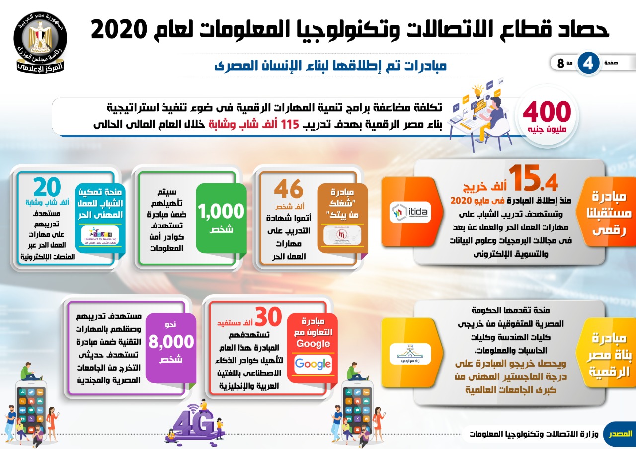 وذكر التقرير أن هناك نحو 8000 شخص تم تدريبهم وتأهيلهم وصقلهم بالمهارات التقنية ضمن مبادرة تستهدف حديثي التخرج من الجامعات المصرية والمجندين، بينما سيتم تأهيل 1000 شخص ضمن مبادرة تستهدف كوادر أمن المعلومات.