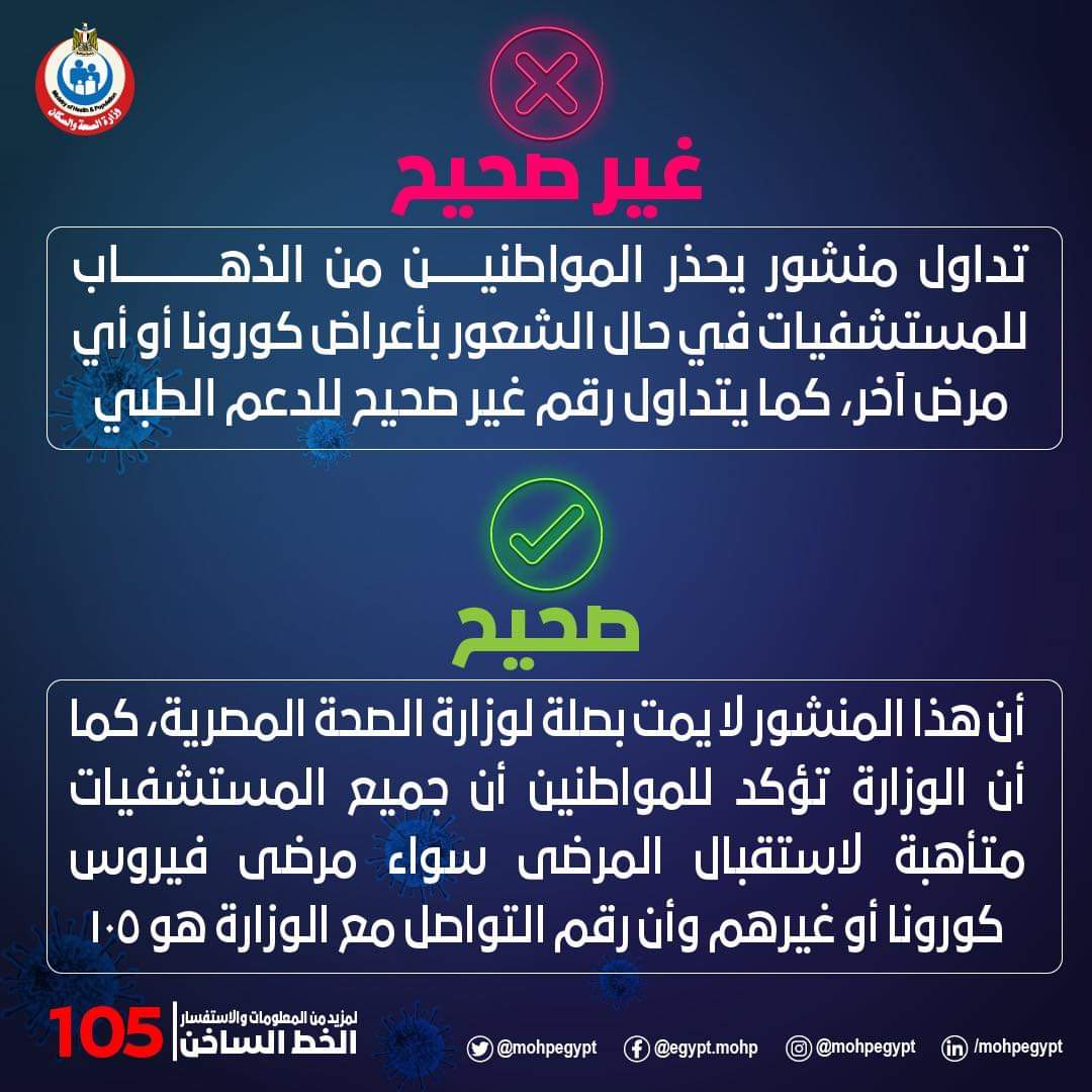 أعلنت وزارة الصحة و السكان، تداول منشور "غير صحيح" يحذر المواطنين من الذهاب للمستشفيات في حال الشعور بأعراض كورونا أو أي مرض آخر، كما يتداول رقما غير صحيح للاتصال بالدعم الطبي.