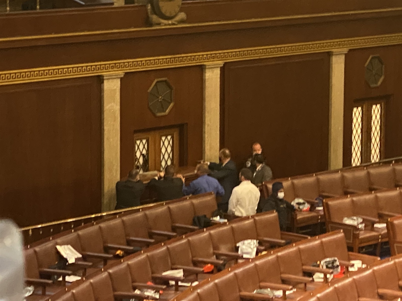 وظهرت صور على مواقع التواصل الاجتماعي لأعضاء الكونجرس يحاولون إغلاق المبنى بواسطة بعض الكراسي لمنع دخول المحتجين.