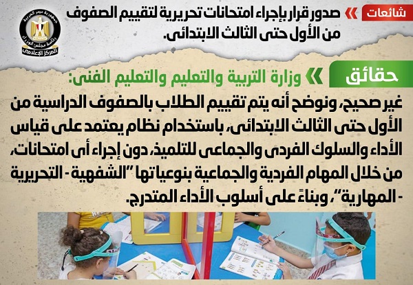 وقام المركز الإعلامي لمجلس الوزراء بالتواصل مع وزارة التربية والتعليم والتعليم الفني، والتي نفت تلك الأنباء، مُؤكدةً أنه لا صحة لصدور قرار بإجراء امتحانات تحريرية لتقييم الصفوف من الأول حتى الثالث الابتدائي، مُوضحةً أنه يتم تقييم الطلاب بالصفوف الدراسية من الأول حتى الثالث الابتدائي، باستخدام نظام يعتمد على قياس الأداء والسلوك الفردي والجماعي للتلميذ، دون إجراء أي امتحانات، من خلال المهام الفردية والجماعية بنوعياتها "الشفهية - التحريرية - المهارية"، وبناءً على أسلوب الأداء المتدرج.