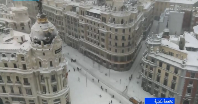 عرضت فضائية "إكسترا نيوز" صورا مباشرة من العاصمة مدريد، حيث شهدت إسبانيا عاصفة ثلجية غير مسبوقة من قبل.