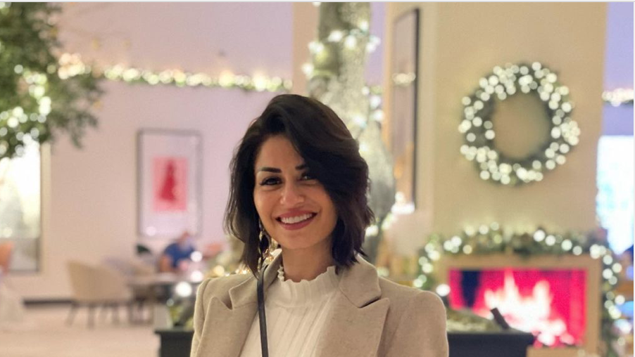 وظهرت منه فضالى، فى الصورة بإطلالة شتوية لافتة بجاكيت طويل باللون البيج وبنطلون أسود ، كما تركت شعرها منسدلا علي كتفها.