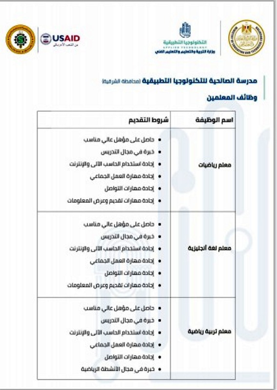 حيث إن محافظة الشرقيةيوجد بها مدرسة الصالحية الزراعية للتكنولوجيا التطبيقية ويمكن الإطلاع على شروط الالتحاق بفريق عمل مدارس التكنولوجيا التطبيقية من خلال الرابط الآتيhttp://tawzef.emis.gov.eg