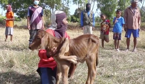 تظهر لقطات مصورة، قرويين يتجمعون في حقل ليتناوبوا لمس البقرة ذات المظهر غير المعتاد في مقاطعة سورين ، شمال شرق تايلاند ، لنيل البركة منها.