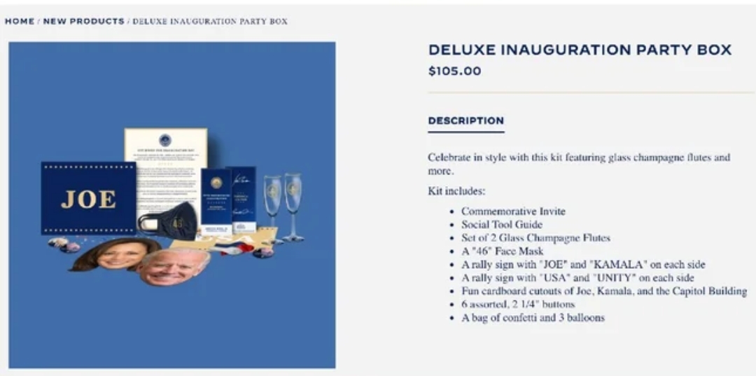 وبحسب صحيفة "ذا هيل" الأمريكية، يبلغ ثمن صندوق الاحتفالات الواحد 105 دولارات أمريكية، حيث يحتوي على زوج من الكؤوس المخصصة لاحتساء الشمبانيا كنخب احتفالي، وقناع واق (كمامة) مزين بالرقم "46"، في إشارة إلى كون بايدن الرئيس السادس والأربعين للولايات المتحدة، وقصاصات من الورق المقوى على هيئات وجه بايدن ونائبة الرئيس المنتخب كامالا هاريس ومبنى الكونجرس، وكيس من قصاصات الورق الملون والبالونات.