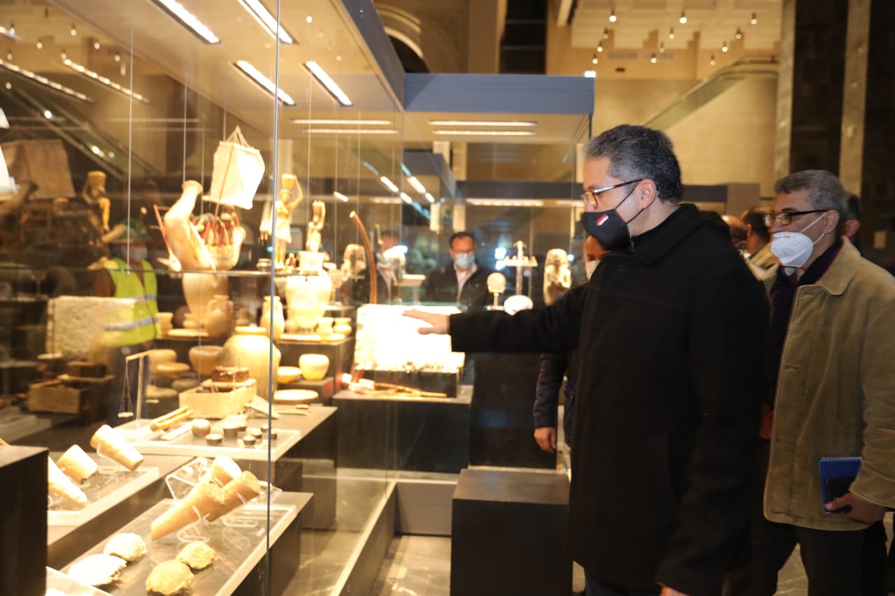 رافقه خلال الجولة الدكتور مصطفى وزيري الأمين العام للمجلس الأعلى للآثار، والدكتور علي عمر رئيس اللجنة العليا لسيناريو العرض المتحفي، وأعضاء اللجنة، والأستاذ مؤمن عثمان رئيس قطاع المتاحف.