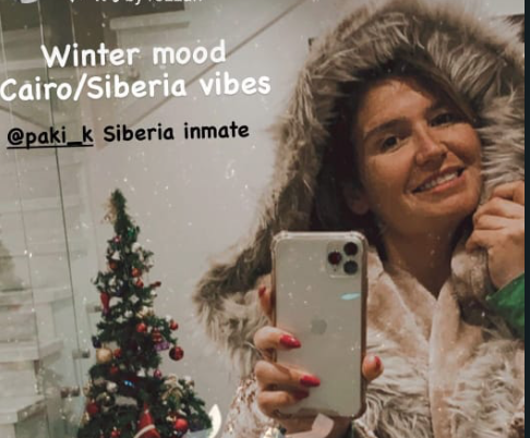 وظهرت هنا بإطلالة شتوية ناعمة مرتدية روب باللون البيج و علقت قائلة : winter mood .cairo |siberia vibes