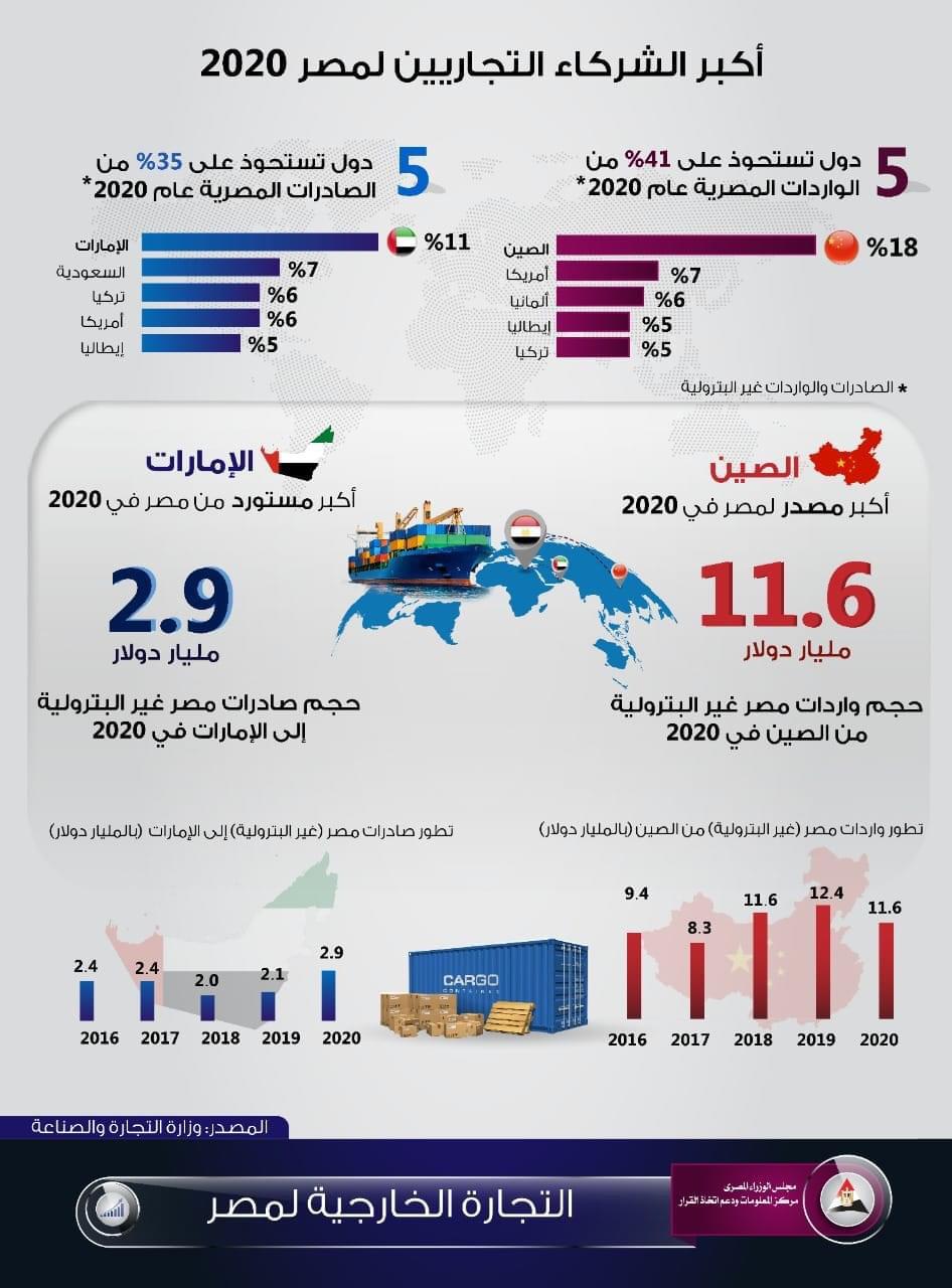 وأوضح الإنفوجراف أن دولتي الصين والإمارات أكبر شركاء مصر التجاريين في 2020، حيث استحوذت 5 دول على 35% من حجم الصادرات المصرية غير البترولية، أكبرهم الإمارات بقيمة صادرات بلغت 2.9 مليار دولار في 2020، مقارنةً بنحو 2.1 مليار دولار في 2019.