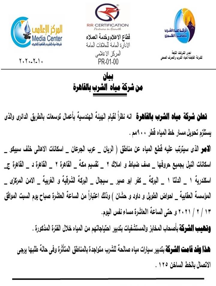 أفادت شركة مياه الشرب بالقاهرة بأنه نظرًا لقيام الهيئة الهندسية بأعمال توسعات بالطريق الدائري، والذي يستلزم تحويل مسار خط المياه قطر 900 مم.