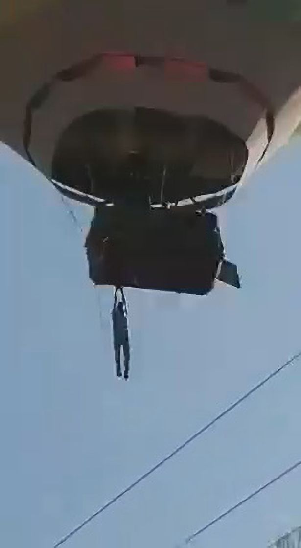 ولكن بشكل لا يصدق ، تمكن من الإمساك بالحبل المتدلي قبل أن يصطدم بالأرض، فيما يعود منطاد الهواء الساخن ببطء إلى الأرض حيث تمسك مجموعة من الأشخاص بملاءة لالتقاطه.