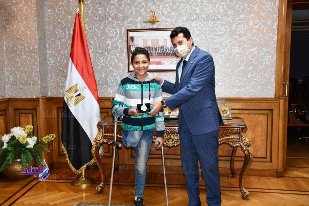 كما قام وزير الشباب والرياضة بتكريم الطفل عمر أيمن سلطان ابن قرية رأس الخليج بمحافظة الدقهلية، الذى تحدى ظروفه الصعبة من حيث ولادته بقدم واحدة ومداومته على ممارسة هوايته المفضلة فى لعب كرة القدم.