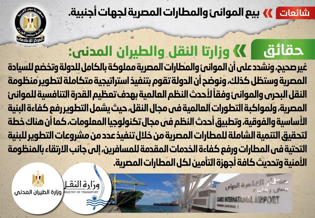 وأكدت الوزارتان أنه لا صحة لبيع أيًا من الموانئ أو المطارات المصرية لجهات أجنبية سواء في الوقت الحاضر أو في المستقبل، وشددتا على أن الموانئ والمطارات المصرية مملوكة بالكامل للدولة وتخضع للسيادة المصرية وستظل كذلك.