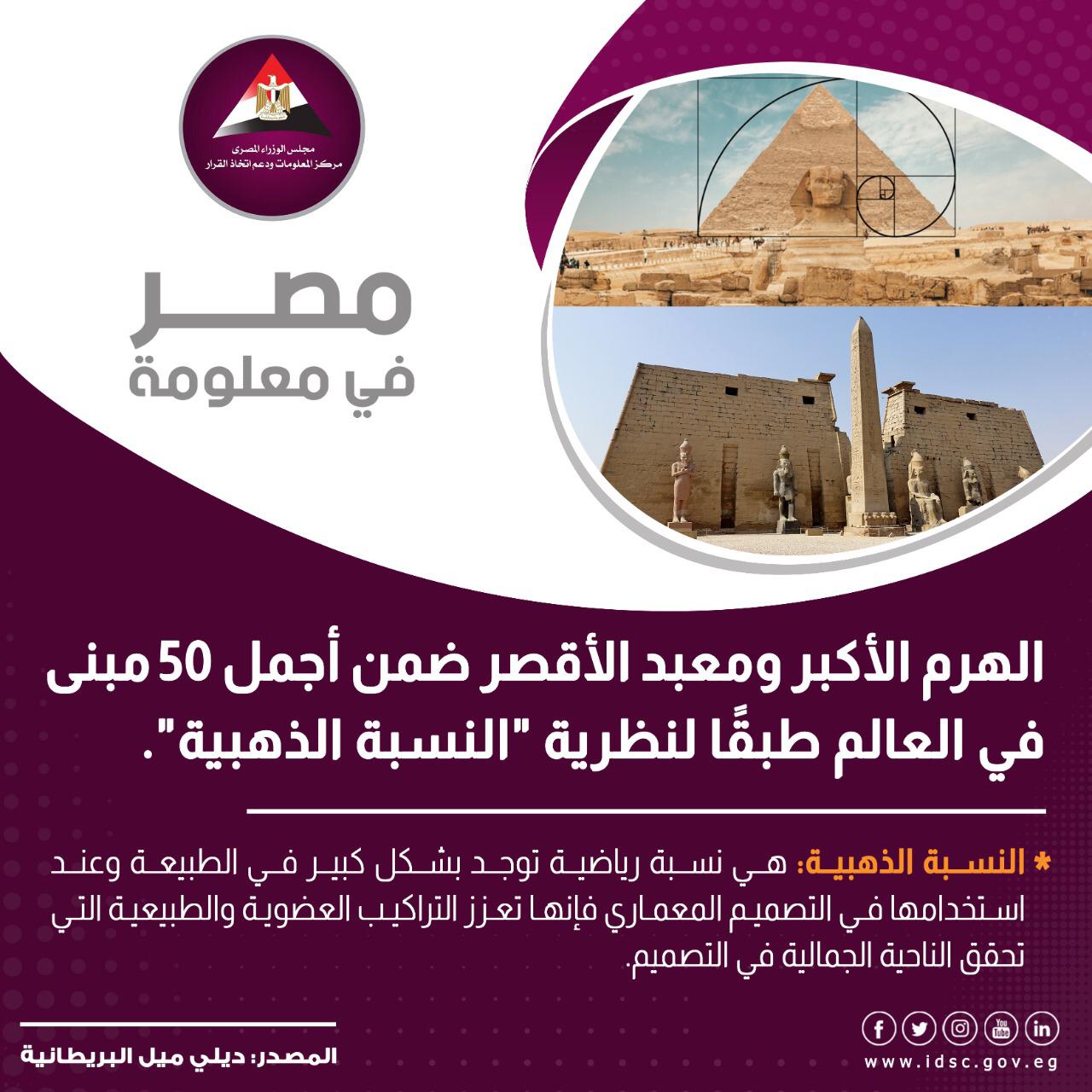 نشر مركز المعلومات ودعم اتخاذ القرارضمن سلسلة "مصر في معلومة"،إنفوجراف بعنوان مصر في معلومة حول دخول الهرم الأكبر بالجيزة ومعبد الأقصر بمدينة الأقصر ضمن أجمل 50 مبنى في العالم وفقًا لجريدة "الديلي ميل" الإنجليزية.