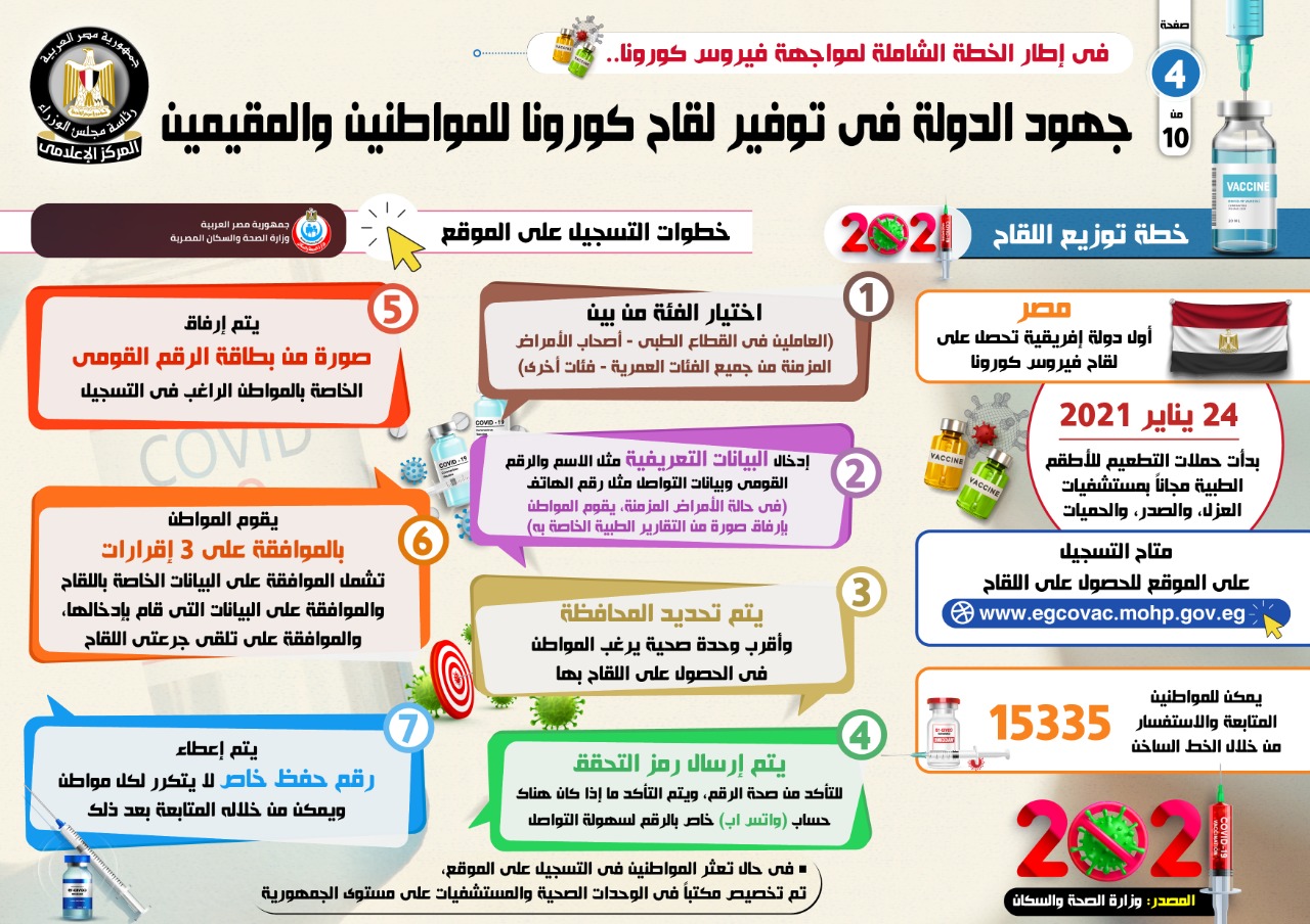 وأشار التقرير إلى أن التسجيل على الموقع الإلكتروني الخاص بالحصول على اللقاح، أصبح متاحًا للفئات المستحقة على الرابط التالي (www.egcovac.mohp.gov.eg)، كما يمكن للمواطنين المتابعة والاستفسار من خلال الخط الساخن 15335.