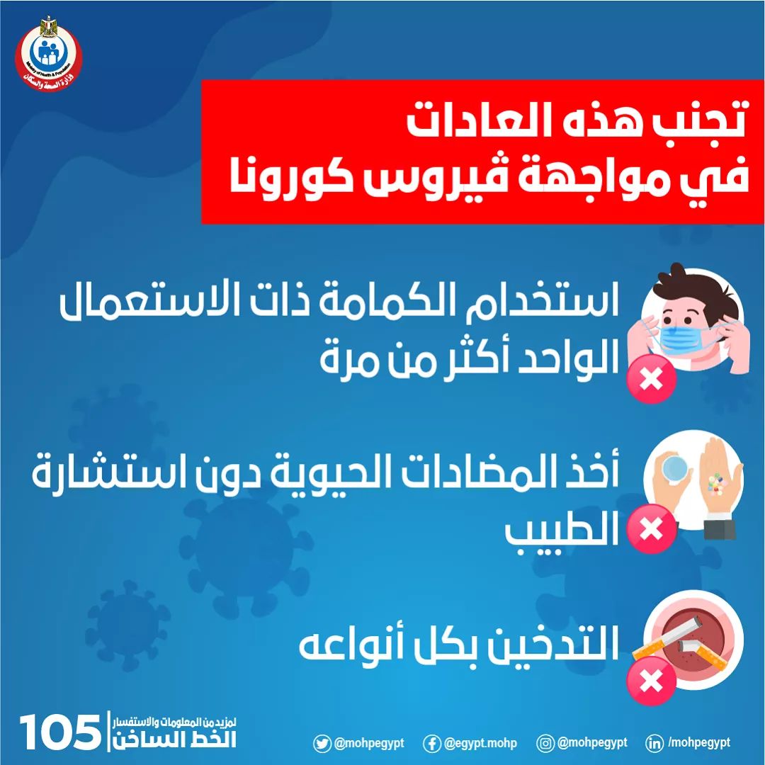 وتواصل وزارة الصحة والسكان رفع استعداداتها بجميع محافظات الجمهورية، ومتابعة الموقف أولًا بأول بشأن فيروس "كورونا المستجد"، واتخاذ كافة الإجراءات الوقائية اللازمة ضد أي فيروسات أو أمراض معدية، كما قامت الوزارة بتخصيص عدد من وسائل التواصل لتلقي استفسارات المواطنين بشأن فيروس كورونا المستجد والأمراض المعدية، منها الخط الساخن "105"، و"15335" ورقم الواتساب "01553105105"، بالإضافة إلى تطبيق "صحة مصر" المتاح على الهواتف ويمكن تحميله من خلال الرابطين التاليين:
