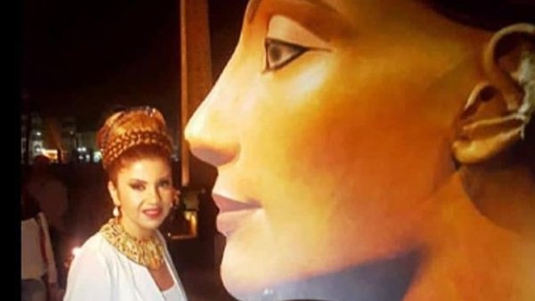 وظهرت بوسي شلبي فى الصورة من أمام أحد التماثيل الفرعونية.