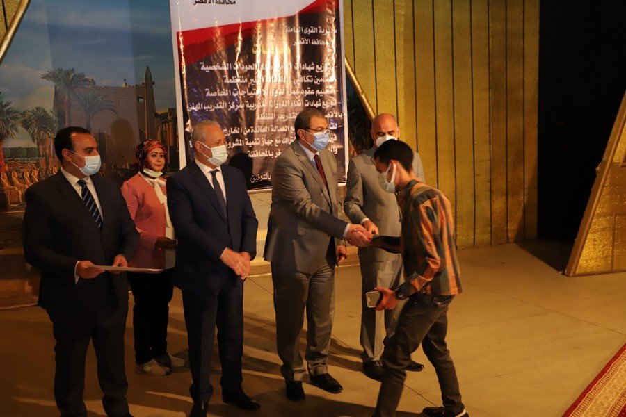 سلم وزير القوى العاملة محمد سعفان، في إطار جولاته الميدانية لمحافظات الصعيد في محطته الثالثة لمحافظة الأقصر، والمستشار مصطفى ألهم، محافظ الأقصر، اليوم الأحد، 46 عقد عمل لذوي الهمم والعزيمة وفرتها مديرية القوى العاملة بالمحافظة من شركات القطاع الخاص بالمحافظة.