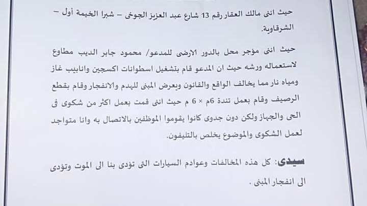 ويقول المواطن مصطفى سيد هيكل في رسالتهم : نحن سكان العقار رقم 13 فى شارع عبد العزيز الخوجى بشبرا الخيمة أول نعاني من ورشة رادياتير أسفل العقار ويقوم صاحبها محمود جابر بتشغيل اسطوانات الاكسجين و انابيب الغاز و مياه النار لتي يصدر عنها انبعاثات خطيرة على الصحة والبيئة ويصدر عنها مخلفات صناعية كارثية مما يعرض المبنى الى الهدم او الانفجار بالإضافة الى الضوضاء غير المحتملة إطلاقا الصادرة عن المعدات الثقيلة والتي تعمل حتى ساعات متأخرة يوميا. .