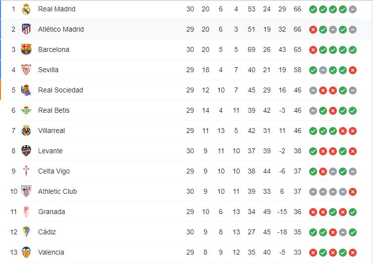 ريال مدريد رفع رصيده إلى 66 نقطة في المركز الأول مؤقتا في جدول ترتيب الدوري الإسباني ، بينما تجمد رصيد برشلونة عند 65 في المركز الثالث.