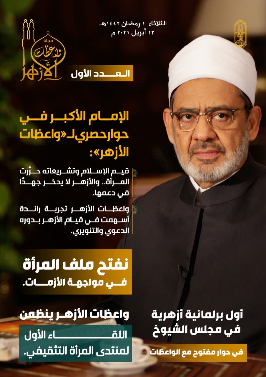 يُصدر مجمع البحوث الإسلامية بالأزهر الشريف، في الأول من شهر رمضان المبارك، العدد الأول من مجلة «واعظات الأزهر»، في إطار توجيهات فضيلة الإمام الأكبر الأستاذ دكتور أحمد الطيب، شيخ الأزهر الشريف، ودعمه لدور الواعظات الدعوي والتوعوي في المجتمع والمشاركة الفاعلة عبر وسائل الاتصال المختلفة التي تقدم قضايا المرأة بالشكل الذي يناسب هذه الفئة المهمة ويلبي احتياجاتها.
