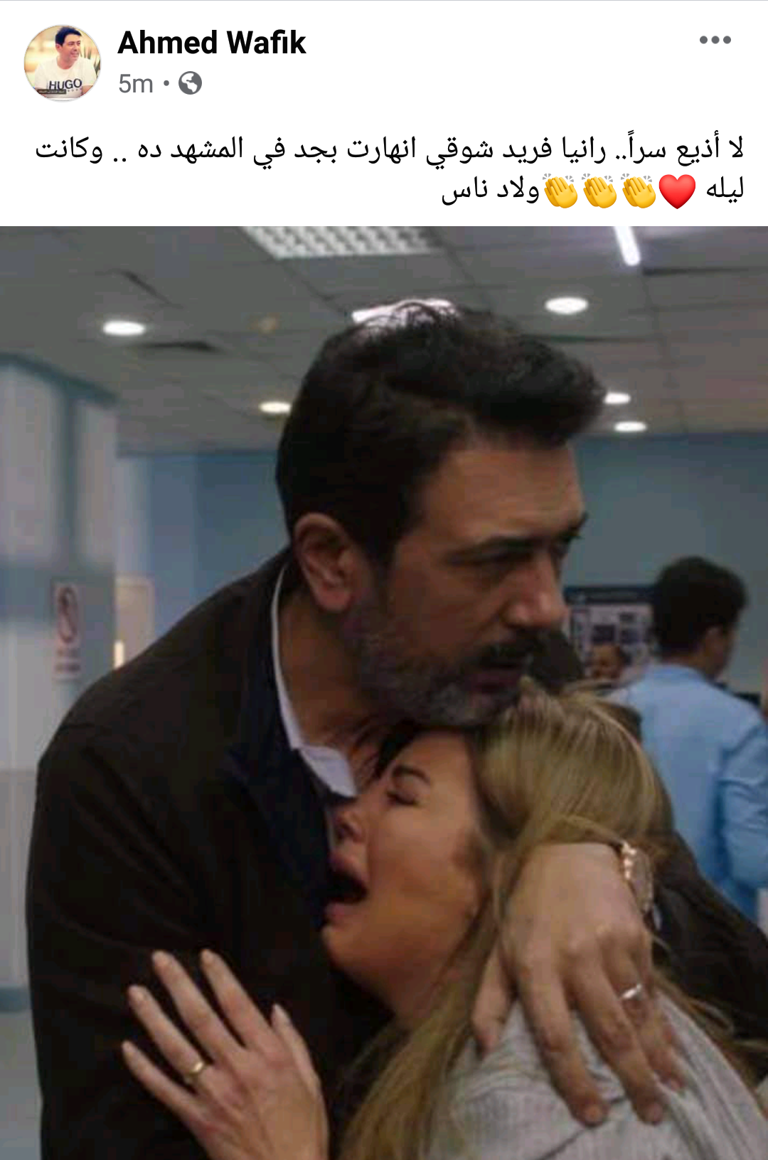 وعلق أحمد وفيق علي الصورة، قائلا: " لا أذيع سراً.. رانيا فريد شوقي انهارت بجد في المشهد ده .. وكانت ليله..ولاد ناس".