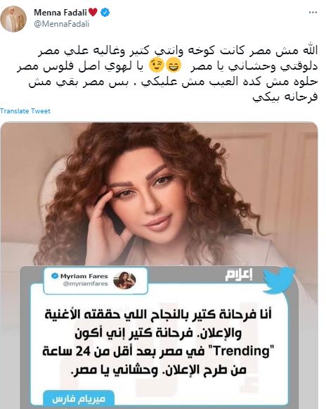 فيما كتبت منة فضالي في تغريدتها قائلة:" الله مش مصر كانت كوخة.. وانتي كتير وغالية علي مصر.. دلوقتي وحشاني يا مصر.. يا لهوي أصل فلوس مصر حلوة مش كده.. العيب مش عليكي.. بس مصر بقي مش فرحانة بيكي".