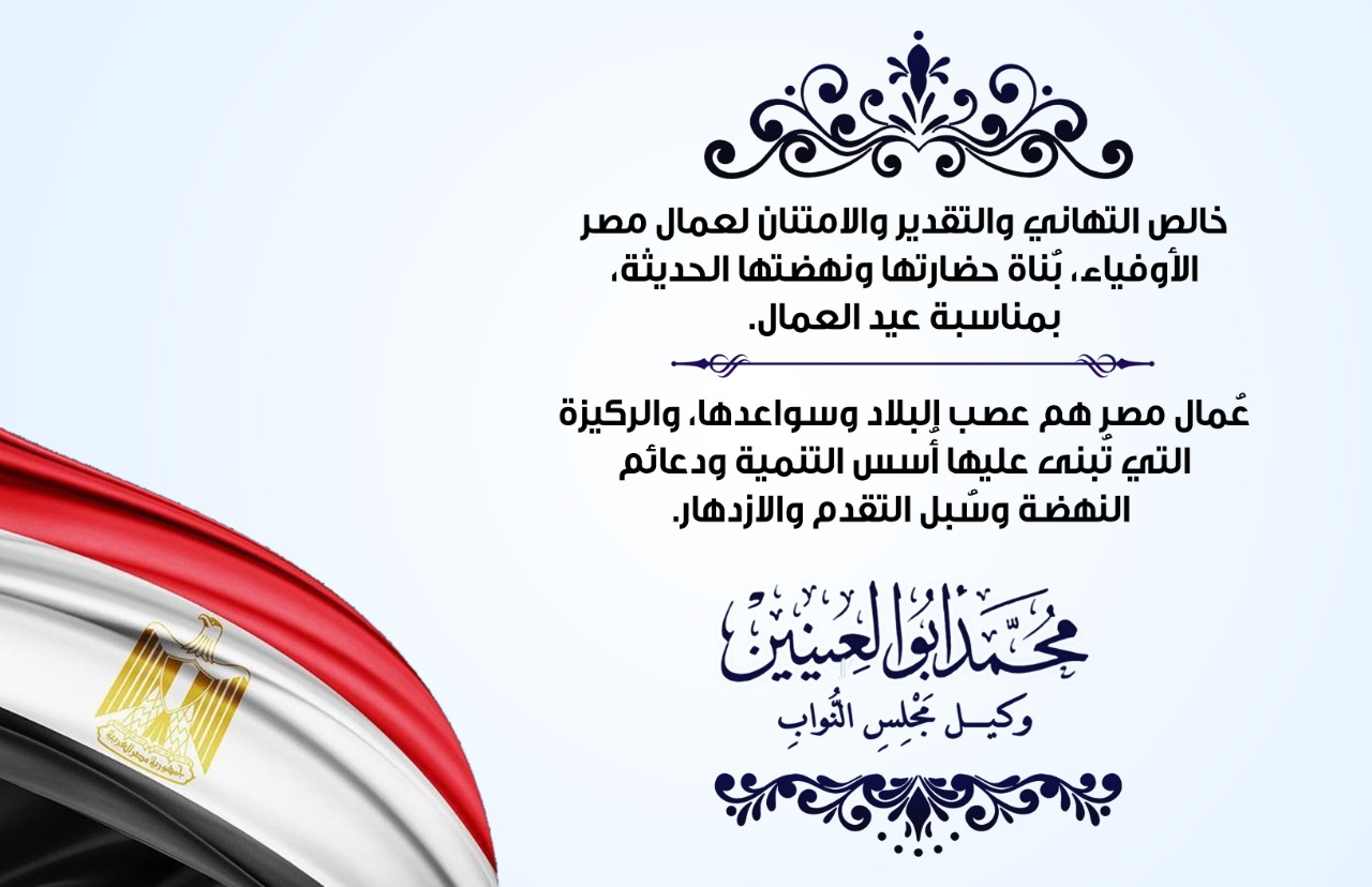 تقدم النائب محمد أبو العينين، وكيل مجلس النواب بالتهنئة لعمال مصر بمناسبة عيد الاحتفال بعيد العمال.